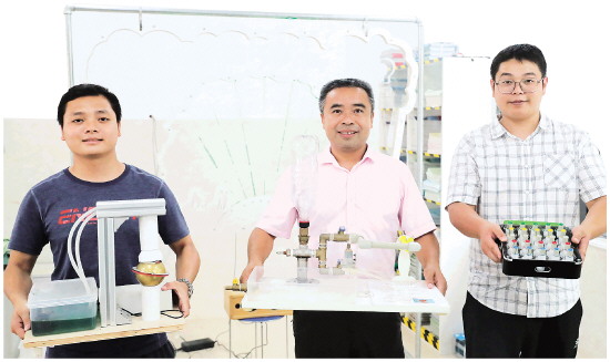beat365亚洲体育在线官网附属小学陆斌副校长(中)与唐昌国(右)、叶明聪老师一起展示自制教具。