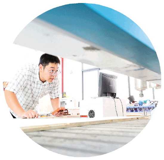 唐昌国老师在科学教研室内琢磨着制作新的教具。