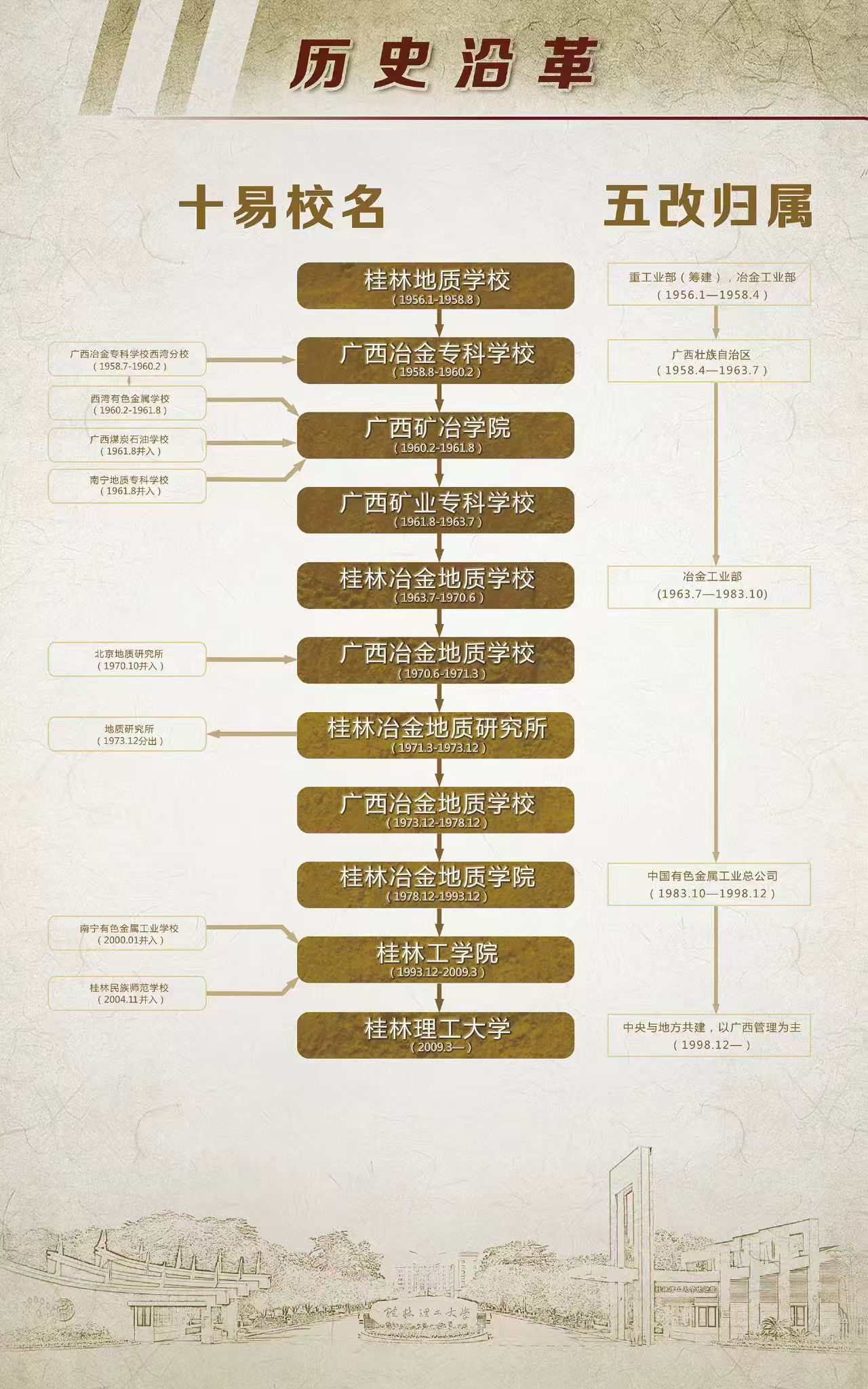 1956年1月,为适应重工业建设需要,根据国家第一个五年计划要求,原国家重工业部决定在桂林组建一所地质性质的专业学校。1956年8月正式定名为桂林地质学校。